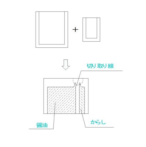 切りとりマークの部分を切りとって逆さにすると、醤油はすぐに落ち、からしは指で押し出せばよい。辛子を使わない人は、切り取りを途中までにすればよい。全部切りとってしまっても、辛子は粘りがあるので、逆さにして落ちるのは醤油のみである。